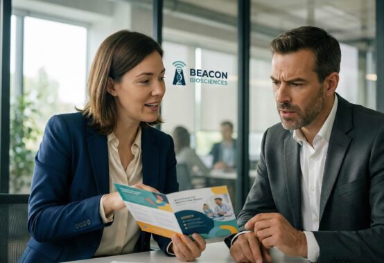 場面:ビーコン・バイオサイエンス社の研究室、夜8時。締切前夜の2人。